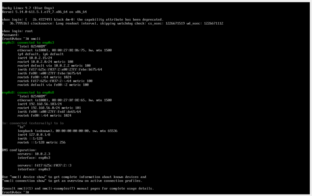 Once the VM is installed, log in as the root user and run the nmcli command.
